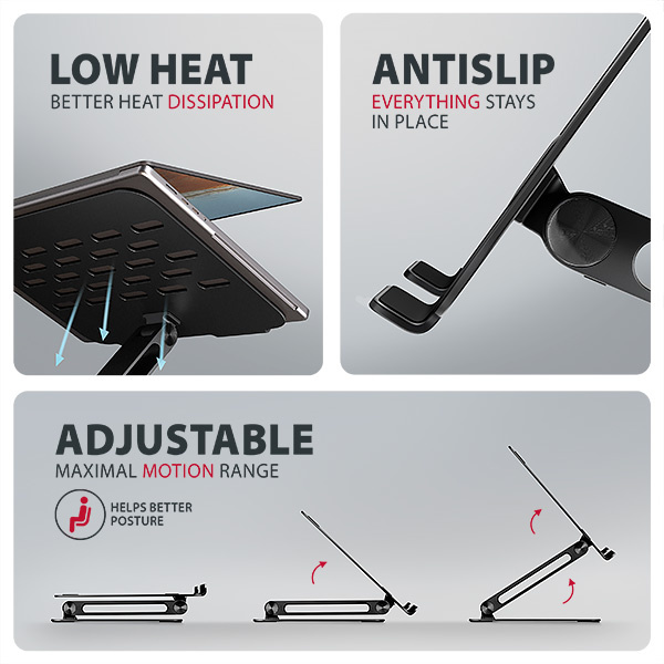 Podstavec je vyroben z robustních hliníkových odlitků garantujících dlouhou životnost a spolehlivost. Díky protiskluzové úpravě se nemusíte obávat nežádoucích pohybů – vaše zařízení zůstane pevně na svém místě, a to bez poškození povrchu notebooku či podložky. Tyto pečlivě navržené vlastnosti zaručují perfektní stabilitu pro váš notebook, tablet nebo dokonce oblíbenou knihu, což vám poskytne klid a pohodlí při každodenním používání.