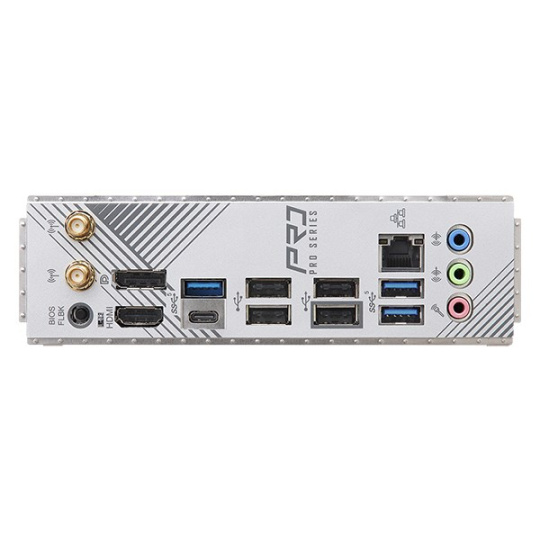 - 2 x Antenna Ports - 1 x HDMI Port - 1 x DisplayPort 1.4 - 3 x USB 3.2 Gen1 Type-A Ports - 1 x USB 3.2 Gen1 Type-C Port - 4 x USB 2.0 Ports - 1 x RJ-45 LAN Port - 1 x BIOS Flashback Button - HD Audio Jacks: Line in / Front Speaker / Microphone
