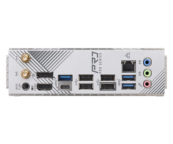 - 2 x Antenna Ports - 1 x HDMI Port - 1 x DisplayPort 1.4 - 3 x USB 3.2 Gen1 Type-A Ports - 1 x USB 3.2 Gen1 Type-C Port - 4 x USB 2.0 Ports - 1 x RJ-45 LAN Port - 1 x BIOS Flashback Button - HD Audio Jacks: Line in / Front Speaker / Microphone