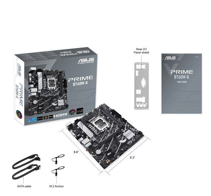 ASUS Prime B760M-K, an Intel® B760 LGA 1700 mATX motherboard with PCIe 4.0, two PCIe 4.0 M.2 slots, DDR5, Realtek 2.5Gb Ethernet, VGA, HDMI™, SATA 6 Gbps, front USB 3.2 Gen 1, Aura Sync