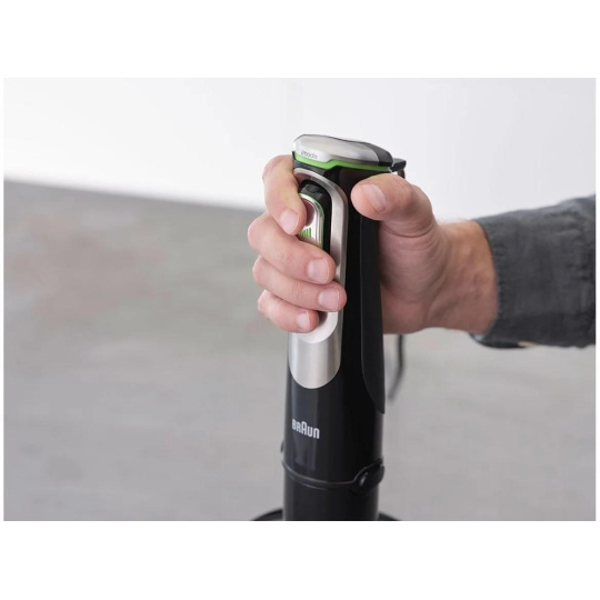 Chystáte sa pripravovať jemné smoothies alebo ovocné pyré? Stačí stlačiť tlačidlo regulácie rýchlosti len ľahko. Chcete od tyčového mixéra ten najvyšší výkon? Potom použite silnejší stlačenie a mixér sa hravo poradí aj so mrazenými potravinami. Ovládanie mixéra Braun tak s inteligentným systémom Advanced SmartSpeed zvládnete aj jedinou rukou a pri vysokých otáčkach máte prístroj stále pod kontrolou. Navyše vďaka mäkkej rukoväti s protisklzovým povrchom padne tyčový mixér MultiQuick 9 tak akurát do ruky.