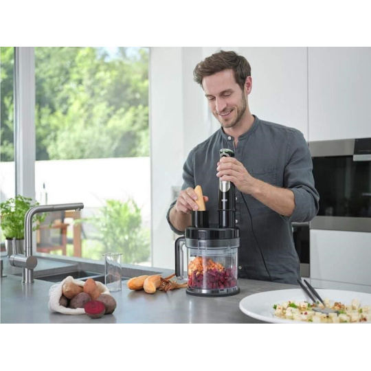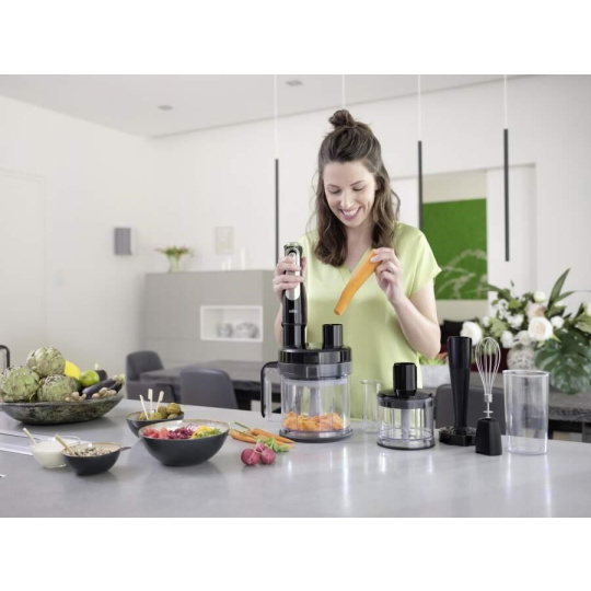 Rozsiahle príslušenstvo, ktoré je spolu s mixérom Braun dodávané, nemusíte složite skrutkovať alebo montovať, keď ho budete potrebovať rýchlo použiť. Mixér Braun disponuje efektívnym systémom EasyClick Plus, vďaka ktorému vymeníte nadstavce ľahko a okamžite, počas len pár sekúnd. Príslušenstvo stačí do mixéru Braun MultiQuick 9 zacvaknúť a ihneď môžete fungovať. Navyše môžete všetky príslušenstvo umývať aj v umývačke riadu.