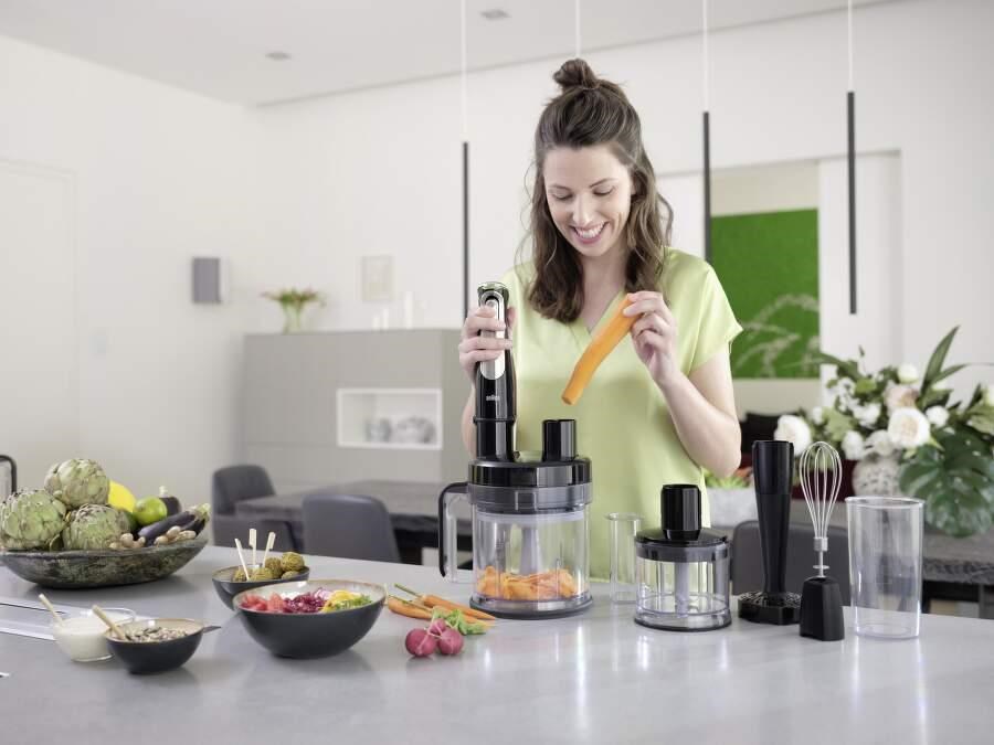 Rozsiahle príslušenstvo, ktoré je spolu s mixérom Braun dodávané, nemusíte složite skrutkovať alebo montovať, keď ho budete potrebovať rýchlo použiť. Mixér Braun disponuje efektívnym systémom EasyClick Plus, vďaka ktorému vymeníte nadstavce ľahko a okamžite, počas len pár sekúnd. Príslušenstvo stačí do mixéru Braun MultiQuick 9 zacvaknúť a ihneď môžete fungovať. Navyše môžete všetky príslušenstvo umývať aj v umývačke riadu.