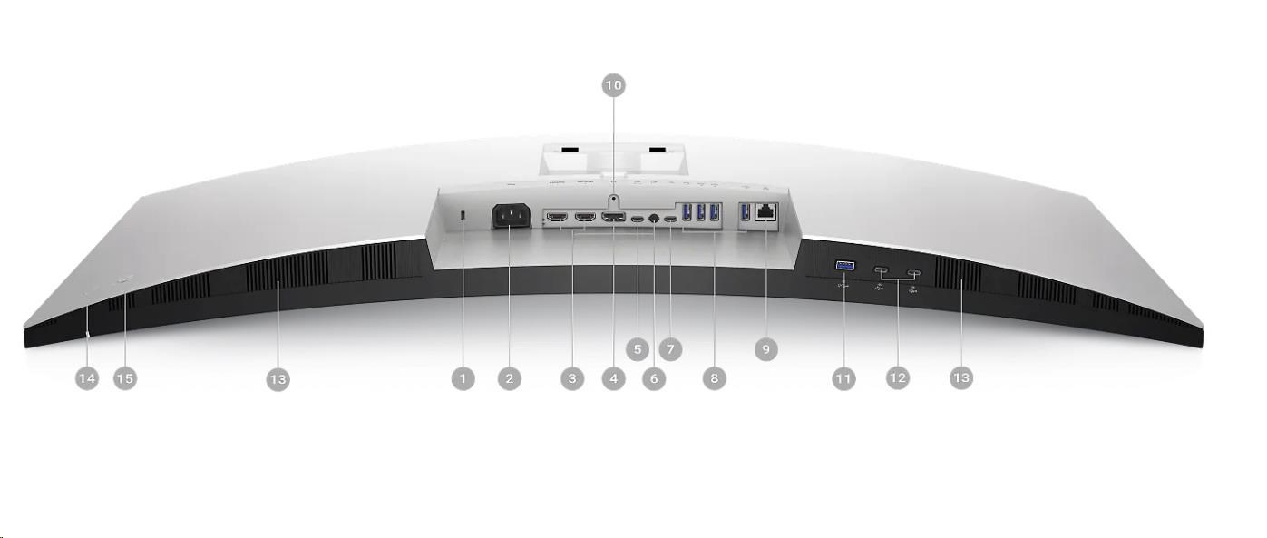| 1. Bezpečnostná zásuvka (na základe Kensington Security Slot™) 2. Napájací konektor 3. 2x HDMI 2.1 4. DisplayPort 1.4 5. USB Type-C upstream port (video a dáta). (Alternatívny režim s DisplayPort 1.4, Podpora napájania až do 90W) 6. Výstup na audio line-out 7. USB Type-C upstream port (len dáta, 10 Gbps, USB 3.2 Gen 2) 8. 4x USB Type-A downstream ports (SuperSpeed USB 10 Gbps, USB 3.2 Gen 2) 9. RJ45 konektor 10. Zámok stojana 11. USB Type-A downstream port (SuperSpeed USB 10 Gbps, USB 3.2 Gen 2) s podaním nabíjania BC1.2 2A (max) 12. 2x USB-C downstream porty (SuperSpeed USB 10 Gbps, USB 3.2 Gen 2) s nabíjaním do 15W (max) 13. Reproduktory 14. Tlačidlo zapnutia/vypnutia 15. Joystick |