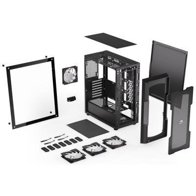 Skriňa formátu Middle Tower s priehľadnou bočnicou z tvrzeného skla ponúka dve 2,5" pozície pre SSD disky a dve 3,5" pozície pre pevné disky. Na hornej časti sa nachádza dva USB 3.0 porty, sluchátek výstup a audio vstup pre mikrofón. Vybavená je štyrmi 120 mm ventilátormi s ARGB podsvietením, ktoré spolu s perforovaným čelným panelom zabezpečujú dostatočné prúdenie vzduchu. Dômyselné riešenie umožňuje pohodlné umiestnenie až 360 mm dlhého výmenníka vodného chladenia na prednej strane. Vo skrini je dostatok priestoru pre chladič CPU do výšky až 162 mm a grafickú kartu o dĺžke až 370 mm. Dodáva sa bez zdroja. Súčasťou je tiež interný ARGB ovládač a sada prachových filtrov.