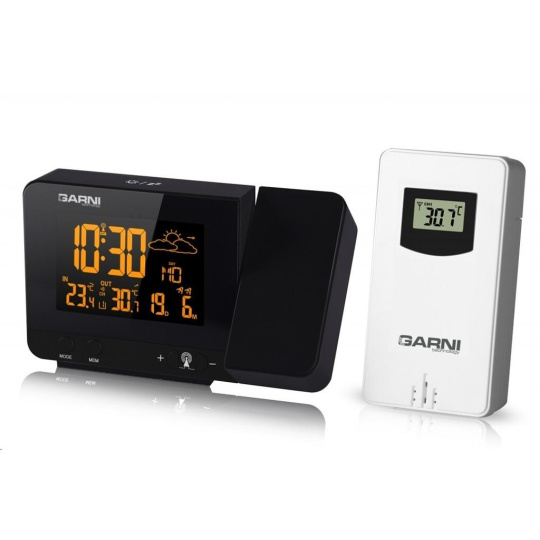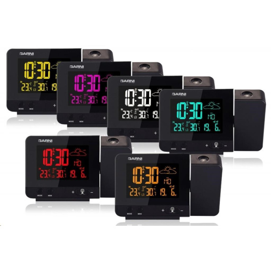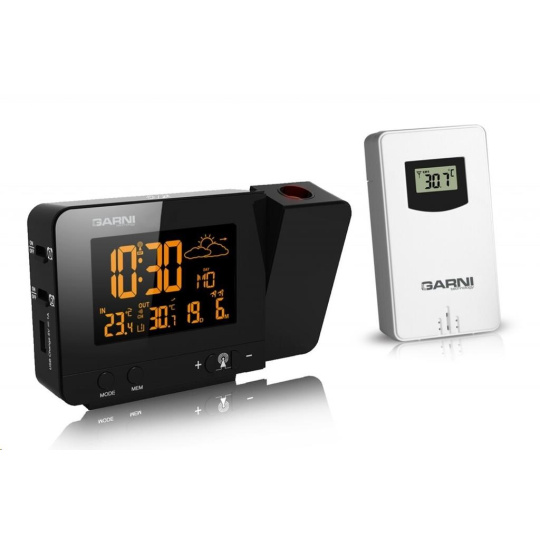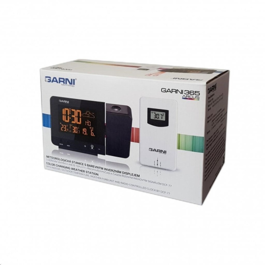 Meteorologická stanica so špičkovým inverzným farebným VA displejom s časovo riadeným rádiovým signálom DCF-77, budíkom, meraním vonkajšej a vnútornej teploty, bezdrôtovým čidlom na meranie vnútornej a vonkajšej teploty a projekciou času a vnútornej / vonkajšej teploty inverzný farebný VA displej o rozmeroch 63 x 42 mm s možnosťou trvalého osvetlenia pri napájaní sieťovým adaptér, alebo krátkodobého osvetlenia na 15 s pri napájaní batériami 3 stupne jasu osvetlenia displeja, možnosť vypnutia osvetlenia displeja s možnosťou krátkodobého osvetlenia na 15 s (pri napájaní sieťovým adaptér) lze nastaviť až 70 farieb displeja, alebo režim automatického plynulého striedania farieb možnosť rýchlej voľby 8 farieb osvetlenia displeja veľkosť číslic na displeji – čas 22 mm, dátum, vnútorná a vonkajšia teplota 10 mm, skratka názvu dňa 7 mm čas a dátum riadené signálom DCF-77 s možnosťou manuálneho nastavenia ikona príjmu signálu DCF-77 skratka názvu dňa 12-hodinový alebo 24-hodinový formát zobrazenia času možnosť nastavenia časového pásma od -1 do +2 hodín budík s 2 budícími časmi s funkciou opakovaného buzenia (Snooze) po 5 minútach budící signál – 20 sekúnd 1 pípnutie za sekundu, 20 sekúnd 2 pípnutia za sekundu, 20 sekúnd 4 pípnutia za sekundu a potom stály pípnutie striedavá projekcia času a vnútornej a vonkajšej teploty (teploty sa striedajú každých 5 s) s možnosťou otočenia obrazu o 180°, možnosť sklopenia tubusu projektora o 90° dopredu a dozadu farba projekcie červená stálu projekciu pri napájaní sieťovým adaptérom s možnosťou vypnutia 6 animovaných ikon predpovede počasia (slnečno, polojasno, oblačno, zrážky, silný dážď a sneženie) na základe sledovania barometrického tlaku vestaveným barometrickým čidlom možnosť nastavenia výchozej ikony predpovede počasia zobrazenie hodnôt vnútornej a vonkajšej teploty pamäť na maximálne a minimálne namerané hodnoty teploty s automatickým mazáním o 0:00 šípky tendencie vývoja barometrického tlaku, vnútornej a vonkajšej teploty indikácia námrazy vonkajšej teploty v rozsahu od -1°C do +3°C ikonou na displeji zobrazenie teploty v °C alebo °F možnosť použitia až 3 bezdrôtových čidiel GARNI 029 (jedno čidlo GARNI 029 je súčasťou dodávky) bezdrôtový prenos hodnôt vonkajšej teploty na frekvencii 433 MHz ikona príjmu signálu bezdrôtového čidla USB port na nabíjanie mobilných zariadení (len pri napájaní hlavnej jednotky sieťovým adaptérom), maximálny nabíjací prúd 1000 mA ikony slabých batérií napájanie sieťovým adaptér alebo batériami možnosť umiestnenia farba čierna Bezdrôtové čidlo GARNI 029 odolné voči vlhkosti displej o rozmeroch xxxxxx mm veľkosť číslic na displeji: teplota xxxxxx mm meranie teploty 3 kanály maximálny RF výkon 10 dBm (10 mW) možnosť umiestnenia a zavešenia farba biela Obsah balenia: 1 x hlavná jednotka GARNI 365 Arcus 1 x bezdrôtové čidlo GARNI 029 1 x sieťový adaptér český, slovenský, nemecký, anglický, taliansky, poľský a maďarský návod