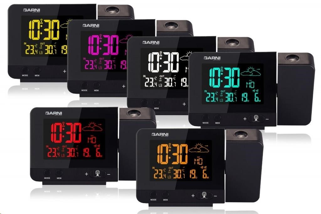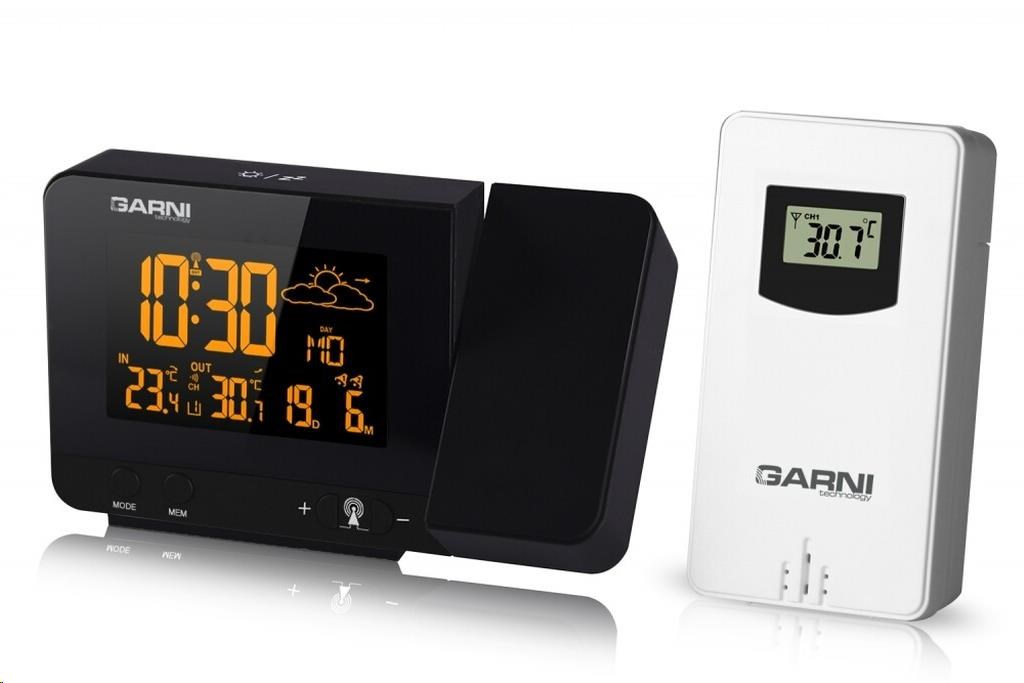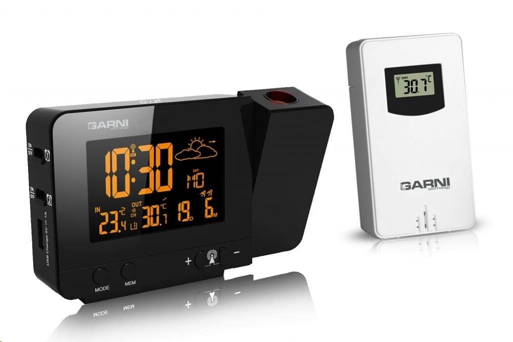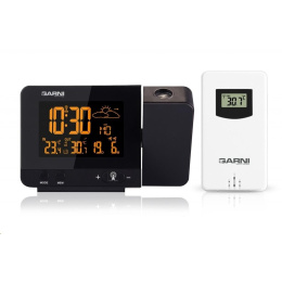 Meteorologická stanica so špičkovým inverzným farebným VA displejom s časovo riadeným rádiovým signálom DCF-77, budíkom, meraním vonkajšej a vnútornej teploty, bezdrôtovým čidlom na meranie vnútornej a vonkajšej teploty a projekciou času a vnútornej / vonkajšej teploty inverzný farebný VA displej o rozmeroch 63 x 42 mm s možnosťou trvalého osvetlenia pri napájaní sieťovým adaptér, alebo krátkodobého osvetlenia na 15 s pri napájaní batériami 3 stupne jasu osvetlenia displeja, možnosť vypnutia osvetlenia displeja s možnosťou krátkodobého osvetlenia na 15 s (pri napájaní sieťovým adaptér) lze nastaviť až 70 farieb displeja, alebo režim automatického plynulého striedania farieb možnosť rýchlej voľby 8 farieb osvetlenia displeja veľkosť číslic na displeji – čas 22 mm, dátum, vnútorná a vonkajšia teplota 10 mm, skratka názvu dňa 7 mm čas a dátum riadené signálom DCF-77 s možnosťou manuálneho nastavenia ikona príjmu signálu DCF-77 skratka názvu dňa 12-hodinový alebo 24-hodinový formát zobrazenia času možnosť nastavenia časového pásma od -1 do +2 hodín budík s 2 budícími časmi s funkciou opakovaného buzenia (Snooze) po 5 minútach budící signál – 20 sekúnd 1 pípnutie za sekundu, 20 sekúnd 2 pípnutia za sekundu, 20 sekúnd 4 pípnutia za sekundu a potom stály pípnutie striedavá projekcia času a vnútornej a vonkajšej teploty (teploty sa striedajú každých 5 s) s možnosťou otočenia obrazu o 180°, možnosť sklopenia tubusu projektora o 90° dopredu a dozadu farba projekcie červená stálu projekciu pri napájaní sieťovým adaptérom s možnosťou vypnutia 6 animovaných ikon predpovede počasia (slnečno, polojasno, oblačno, zrážky, silný dážď a sneženie) na základe sledovania barometrického tlaku vestaveným barometrickým čidlom možnosť nastavenia výchozej ikony predpovede počasia zobrazenie hodnôt vnútornej a vonkajšej teploty pamäť na maximálne a minimálne namerané hodnoty teploty s automatickým mazáním o 0:00 šípky tendencie vývoja barometrického tlaku, vnútornej a vonkajšej teploty indikácia námrazy vonkajšej teploty v rozsahu od -1°C do +3°C ikonou na displeji zobrazenie teploty v °C alebo °F možnosť použitia až 3 bezdrôtových čidiel GARNI 029 (jedno čidlo GARNI 029 je súčasťou dodávky) bezdrôtový prenos hodnôt vonkajšej teploty na frekvencii 433 MHz ikona príjmu signálu bezdrôtového čidla USB port na nabíjanie mobilných zariadení (len pri napájaní hlavnej jednotky sieťovým adaptérom), maximálny nabíjací prúd 1000 mA ikony slabých batérií napájanie sieťovým adaptér alebo batériami možnosť umiestnenia farba čierna Bezdrôtové čidlo GARNI 029 odolné voči vlhkosti displej o rozmeroch xxxxxx mm veľkosť číslic na displeji: teplota xxxxxx mm meranie teploty 3 kanály maximálny RF výkon 10 dBm (10 mW) možnosť umiestnenia a zavešenia farba biela Obsah balenia: 1 x hlavná jednotka GARNI 365 Arcus 1 x bezdrôtové čidlo GARNI 029 1 x sieťový adaptér český, slovenský, nemecký, anglický, taliansky, poľský a maďarský návod