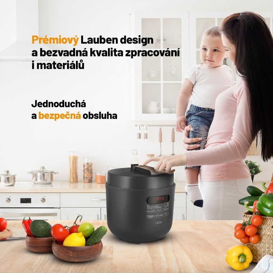 Viacúčelový a energeticky úsporný elektrický tlakový hrniec Lauben Electric Pressure Cooker 5000AT vie vďaka tlaku vo vnútri pripraviť chutné pokrmy za rekordne krátku dobu. Čas, ktorý ušetríte, tak môžete venovať sebe či rodine. Zároveň ušetríte aj peniaze, pretože spotreba energie je pri tomto spôsobe varenia nižšia. Kratšia príprava prospieva aj surovinám, ktoré si uchovávajú viac živín. Stačí pritom jediné, vložiť všetko potrebné do hrnca, zavrieť, zapnúť a o všetko ostatné sa už prístroj postará sám.