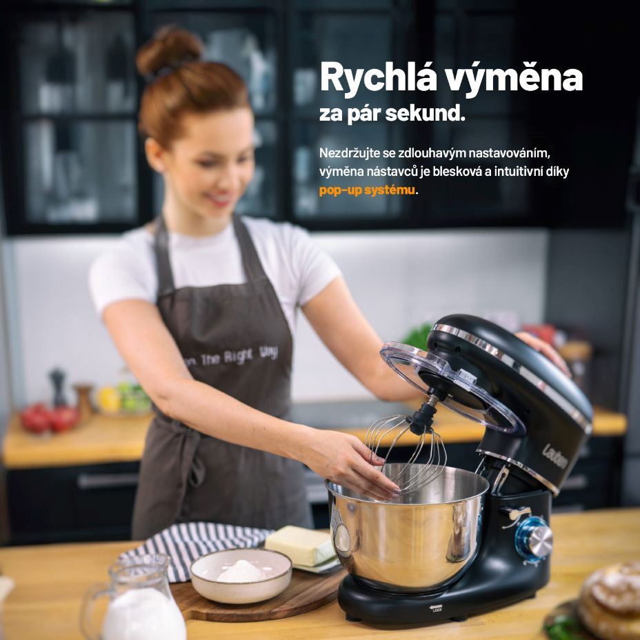 Varenie a pečenie sa stane ešte väčšou zábavou, s viacúčelovým kuchynským robotom Lauben Kitchen Machine 550BC s výkonom 1400 W všetko zvládnete ľahko a rýchlo. Netreba sa báť ani prípravy tuhšieho cesta, celokovové prevody si s vysokou záťažou poradia. Misa s objemom 5,5 l z nerezovej ocele pojme skutočne veľa a veko bráni úniku obsahu pri spracovaní. Suroviny je možné počas prevádzky pridávať cez plniacu otvor vo veku. Pri všetkom, čo dokáže, je robot menších rozmerov a nezaberie tak na linke príliš miesta. Svojim dizajnom ju však bude aj zdobiť. Prístroj pohodlne ovládate jednou rukou vďaka One Touch systému, manipuláciu uľahčuje tiež Pop-up systém slúžiaci k výmene nadstavcov. Robot disponuje hneď niekoľkými nadstavcami, pre miešanie, šľahanie či miesenie a ku každému z nich nájdete v balení chutný recept na inšpiráciu.