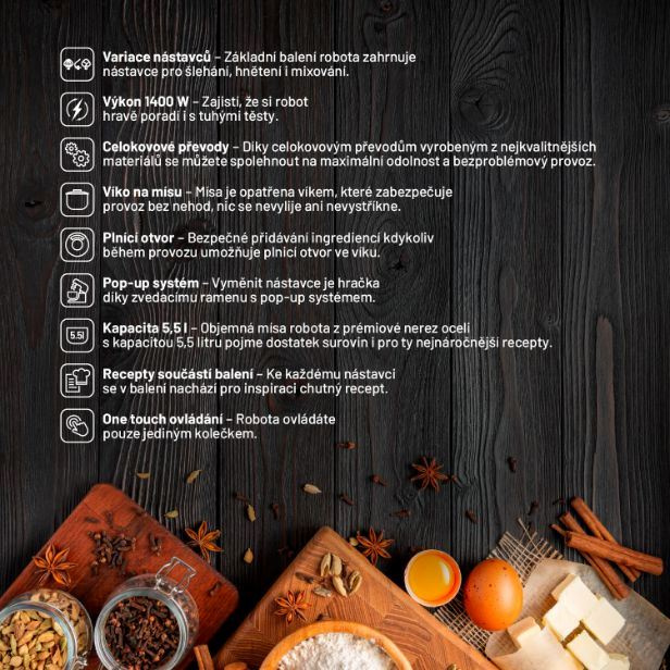 Pri svojich kompaktných rozmeroch disponuje kuchynský robot motorom s výkonom 1400 W, zvládne tak umiesiť aj tuhšie cesto.