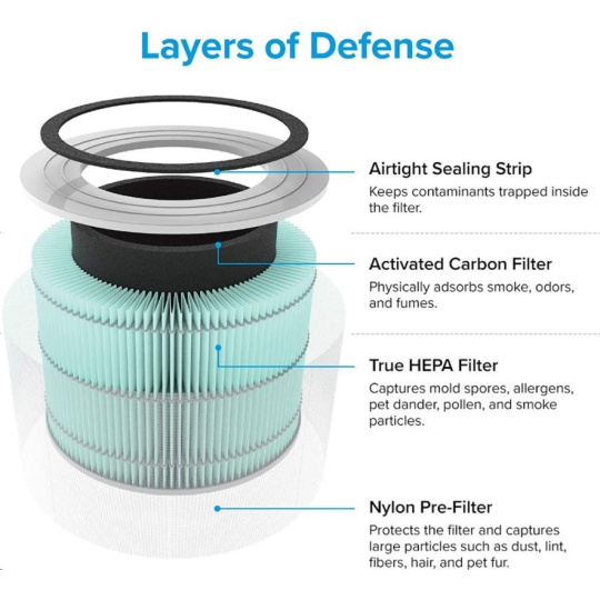 Druhou vrstvou je HEPA filter H13. To odlišuje Levoit od konkurencie, pretože filter HEPA H13 je oveľa kvalitnejší a spoľahlivejší ako bežne používané HEPA H11. Tu sa odfiltrujú jemné prachové častice, pleseň, baktérie, peľ, dymové častice, roztoče a srsť.