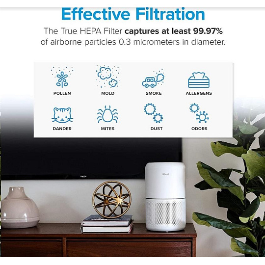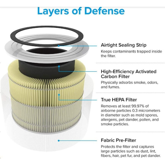 Druhou vrstvou je HEPA filter H13. To odlišuje Levoit od konkurencie, pretože filter HEPA H13 je oveľa kvalitnejší a spoľahlivejší ako bežne používané HEPA H11. Tu sa odfiltrujú jemné prachové častice, pleseň, baktérie, peľ, dymové častice, roztoče a srsť.