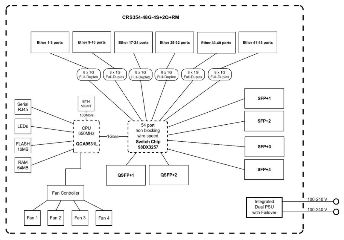 ak hľadáte jediný prepínač, ktorý vám umožní predbehnúť nastavenie siete a napájať všetky potrebné zariadenia - už nemusíte hľadať ďalej! Nové zariadenie CRS354-48P-4S+2Q+RM je efektívne a prispôsobiteľné riešenie na montáž do stojana na správu sietí v najnáročnejších prostrediach. Na rozdiel od mnohých iných prepínačov sú naše produkty vyrobené s ohľadom na správcu systému.