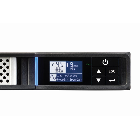 - Nový grafický LCD displej poskytuje na jednej obrazovke základné informácie o stave UPS a o meraných veličinách (v sedemjazyčných verziách podľa voľby). Sú k dispozícii aj rozšírené možnosti konfigurácie pomocou zrozumiteľných navigačných tlačidiel.