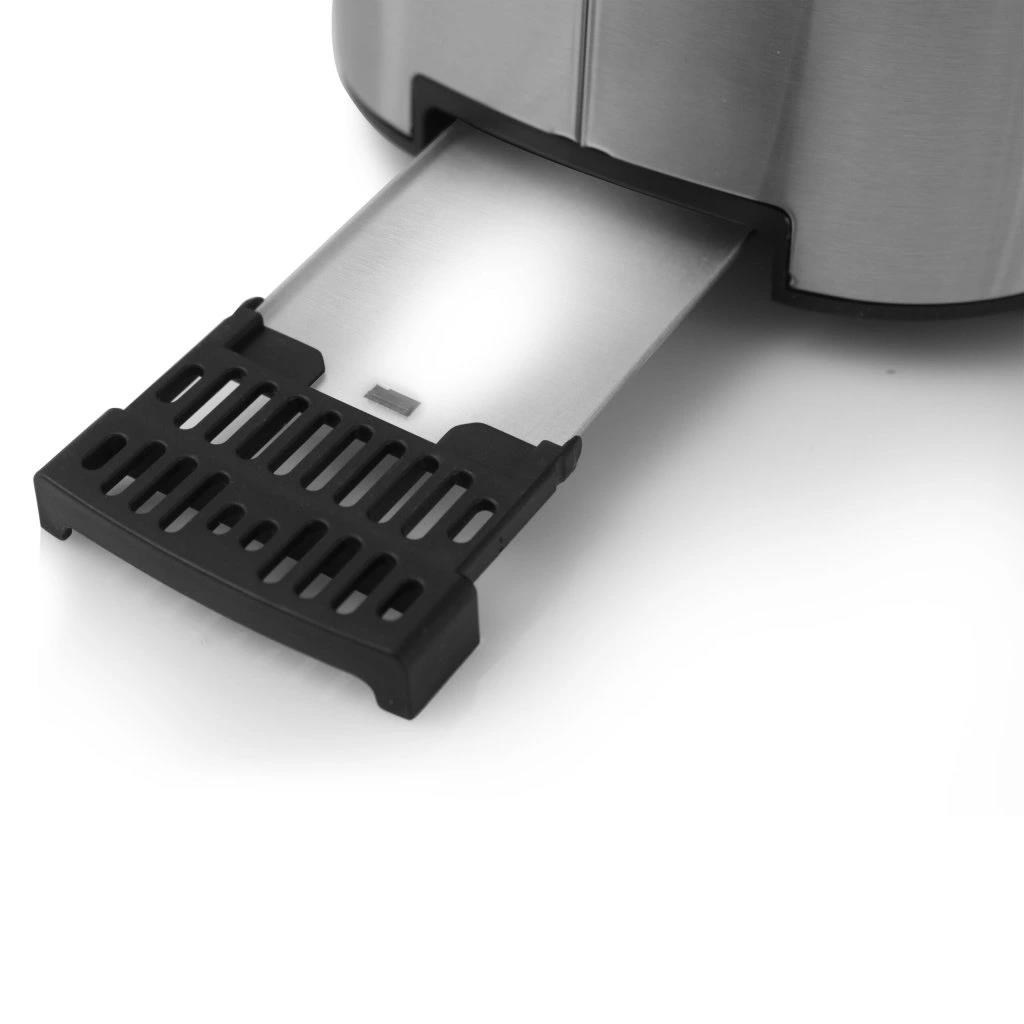 Výsuvná miska na drobky zabezpečuje jednoduché čistenie, zatiaľ čo automatické centrovanie a vysunutie pečiva zaručuje rovnomerné opečenie a pohodlné vyberanie.