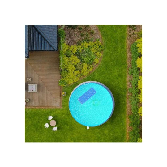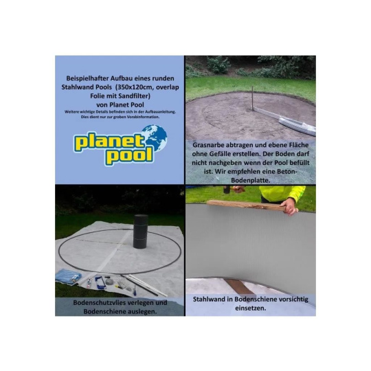 Nadzemné bazény Planet Pool s oceľovou stenou sú určené na celoročné používanie. Odpadá tak potreba bazén demontovať na jeseň a znova inštalovať na jar ako u sezónnych bazénov s nafukovacím límcom či rámovou konštrukciou. Vďaka žiarovo pozinkovanej a nátierkou ošetrenej oceľovej stene a mrazuvzdornej fólii je bazén pripravený na všetky rozmary prírody. Tento bazén je veľmi stabilný, pevný s dlhodobou životnosťou.   Moderná ANTRACITOVÁ nátierka steny bazénu + PIESKOVÁ PVC závesná fólia.   Bazén je vhodný na inštaláciu na rovnom podklade s dostatočnou vzdialenosťou od potenciálneho spadu nečistôt zo stromov a strechy. UV stabilizácia PVC fólie zabezpečuje jej farebnú stálosť a životnosť. Tento bazén predstavuje osvedčenú koncepciu bazéna a pozitívnu historickú skúsenosť.   Bazén sa inštaluje pomocou spodných a horných líšt, do ktorých sa zasúva oceľová stena. Oba kraje steny sa prepoja pomocou vnútorných a vonkajších líšt a skrutiek. Mrazuvzdorná fólia sa pomocou zalomenia k hornej časti oceľovej steny zavestí a tvaruje do bazéna podľa vizuálnych požiadaviek. Fólia je flexibilná a na mieru vyrobená pre tento typ bazéna (nie je potrebná žiadna úprava). Pre montáž krok za krokom sledujte pokyny v montážnom návode.   Parametre: Tvar bazéna: guľatý tvar Rozmery bazéna: 350 x 90 cm Oceľová stena: 0,3 mm UV stabilizovaná PVC fólia, hrúbka 0,2 mm, farba PIESKOVÁ Farba bazéna: ANTRACITOVÁ Dierovanie pre štandardný vestavný skimmer a spätnú trysku dostupné Horná a podlahová lišta z plastu Bazén zodpovedá európskej norme pre bazény EN 16562-2