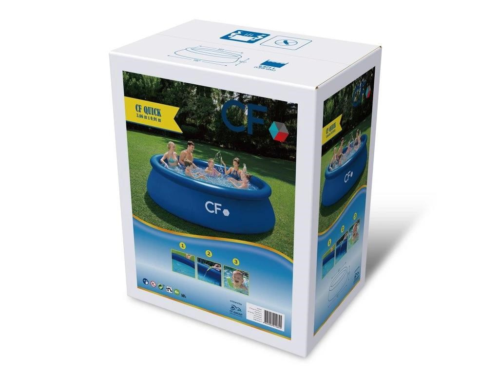 Pripravte sa na teplé počasie a nekonečné hodiny vodných radovánok na vlastnej záhrade so samonosným nadzemným bazénom CF QUICK. Tento nadzemný bazén v modrej farbe je navrhnutý pre jednoduchú montáž a môže byť pripravený počas niekoľkých minút. Stačí len pripraviť správne miesto na bazén, rozprestrieť bazénovú podložku, rozbaliť bazén, nafúknuť prstenec a napustiť vodu. Stúpajúca voda bazén sama postaví. Tento kruhový nadzemný bazén s priemerom 366 cm je ideálny pre celú rodinu a vďaka absencii pevných prvkov je vhodný aj pre menšie deti (deti musia zostať pod dohľadom dospelej osoby). Bazén je vyrobený z odolných a super pevnych PVC materiálov, aby bolo zaistené, že zostane stáť aj pri všetkej zábave, ktorú tento bazén ponúka.