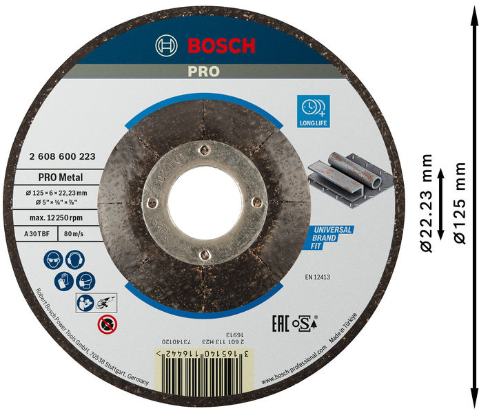 Navrhnuté pre brúsenie kovu - Kotúč PRO Metal sme vyrobili pre kovovýrobcov, ktorí potrebujú spoľahlivý hrubovací kotúč s dlhou životnosťou na brúsenie kovu. Odolný hrubovací kotúč PRO Metal využíva vysoko kvalitné korundové zrná k efektívnemu brúsenie kovu a oceli. Zrná kombinované s funkčnými plnivami a zalité do matrice z fenolovej živice zabezpečujú pevnosť, odolnosť voči teplu a stabilnú výkonnosť. Presne vyrobená sieť zo sklenených vlákien vystužuje kotúč pre väčšiu bezpečnosť. S otvorom 22,23 mm pre štandardné uhlové brúsky s pojistnou maticou