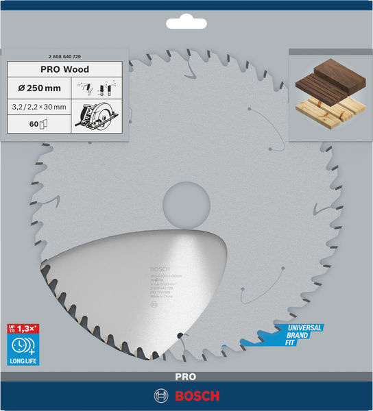 Vydrží až 1,3× dlhšie než pilový kotúč Bosch Eco for Wood - Pilový kotúč PRO Wood je navrhnutý tak, aby vyriešil vaše problémy pri rezaní všetkých typov masívneho dreva a doskových materiálov na báze dreva. Vyrobili sme ho pevný a dobre vyvážený, aby sme zabezpečili čisté a presné rezy – na dlhú dobu. Pilový kotúč PRO Wood je skvelou voľbou pre tesárov a karkulárov pracujúcich so všetkými druhmi masívneho dreva a doskových materiálov na báze dreva. Pilový kotúč pre okružné píly na drevo má presne brúsené karbidové zuby, ktoré mu zabezpečujú pevnosť a odolnosť. Vďaka telu z kalenej ocele je stabilný a zabezpečuje presné rezanie. Dilatačné drážky znižujú hromadenie tepla a zabezpečujú tak dlhodobý výkon. Rôzne veľkosti príslušenstva môžu/nemožno vyžadovať osadenie redukčných krúžkov