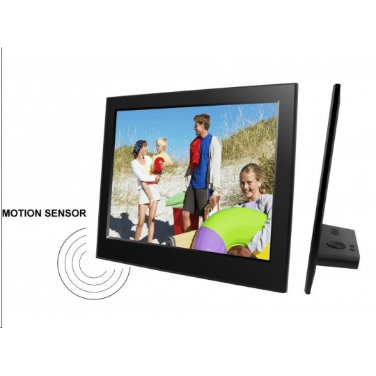 Digitálny fotorámik s uhlopriečkou 8", ultratenký 6,5 mm s opierkou, vysoké rozlíšenie 1280x800px, 16:10, Motion Senzor pohybu, prezeranie obrázkov vo formáte JPEG, posluch hudby MP3/WMA a prehrávanie videa Full HD MPEG1/2/4, multislot SD/MS a USB2 flash max 32GB, Audio out, Auto Start/ON/OFF, funkcie: SlideShow (prezentácia), náhľady, zoom a otáčanie obrázkov, budík, hodiny, kalendár. Rozmer: 220x176x23 mm, hmotnosť 440 g. Súčasťou dodávky sieťový zdroj AC/DC 5V/1,5A, diaľkové ovládanie.