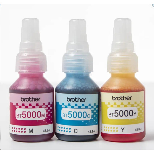 Výhodné balenie fliaš Brother BT5000CLVAL s azúrovým, purpurovým a žltým inkusom. Každá farebná inkoustová fľaša vytlačí až 5000 strán.