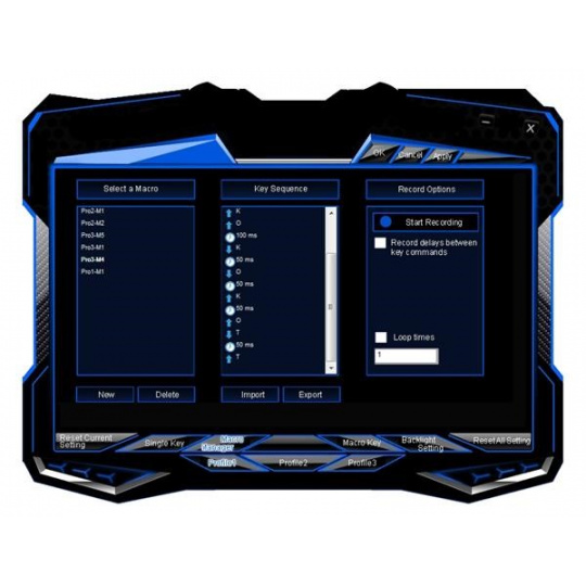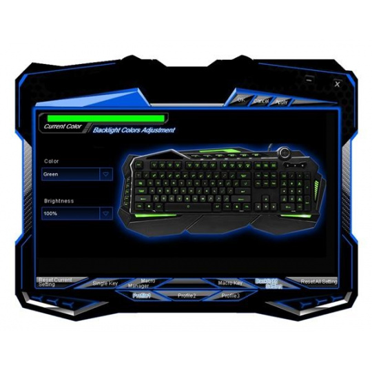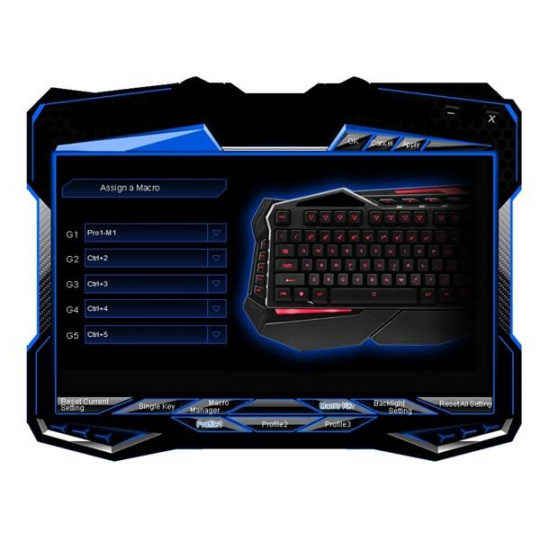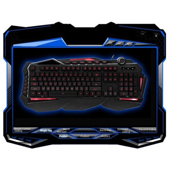 3 profily - na klávesnici nájdete tlačidlá na prepínanie medzi 3 nezávislými profilmi. Pre každý profil môžete individuálne nastaviť farbu podsvietenia, jeho intenzitu, makrá a preddefinované klávesy...