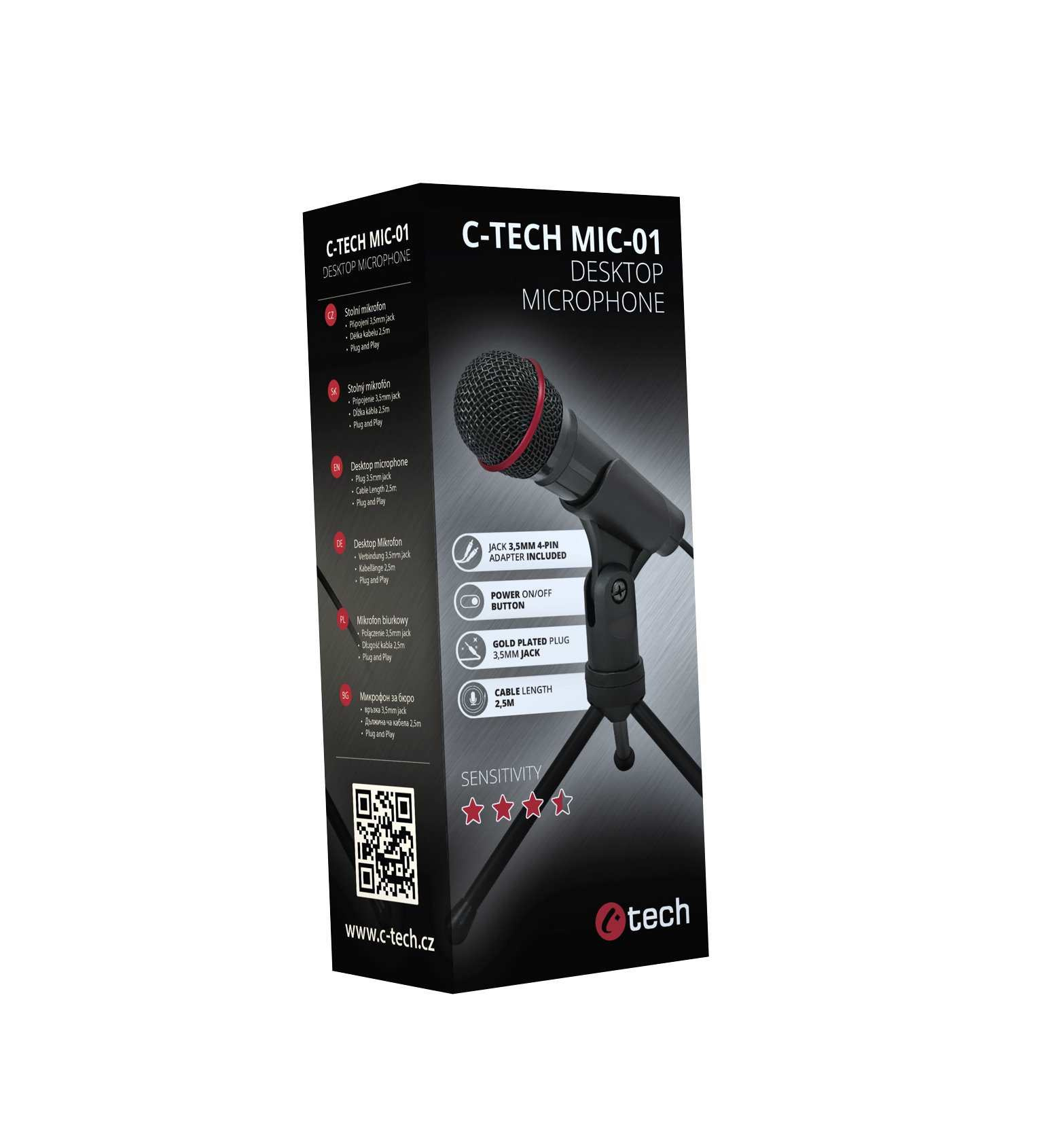 C-TECH MIC-01 je vysokokvalitný mikrofón s prirodzenou kvalitou reprodukcie hlasu na každodenné použitie. Je vhodný na používanie s komunikačnými programami, ako aj na vytváranie videí na YouTube alebo živých prenosov. Mikrofón sa pripája pomocou 2,5 m kábla s pozláteným 3,5 mm stereo jack konektorom, ale súčasťou balenia je aj stereo redukcia 3-pin/4-pin jack na pripojenie mikrofónu k zariadeniu, ktoré má kombinovaný zvukový konektor pre mikrofón a slúchadlá. Mikrofón je vybavený tlačidlom ON/OFF. V balení nájdete praktický statív, vďaka ktorému môžete mikrofón umiestniť do rôznych polôh.