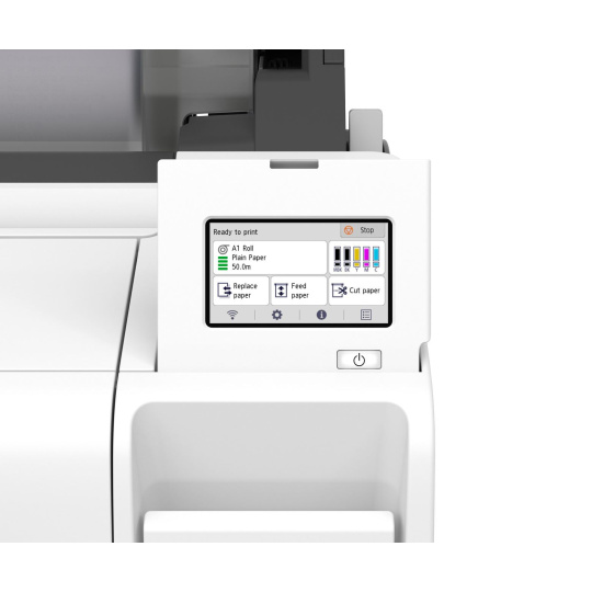 Funkčný dizajn 4,3" dotykového panelu umožňuje intuitívne zobrazenie pokynov a dôležitých informácií, ako je typ média, zostávajúce a množstvo atramentu. Kotúč papiera je možné ľahko vymeniť na hornom kryte s rovným povrchom.