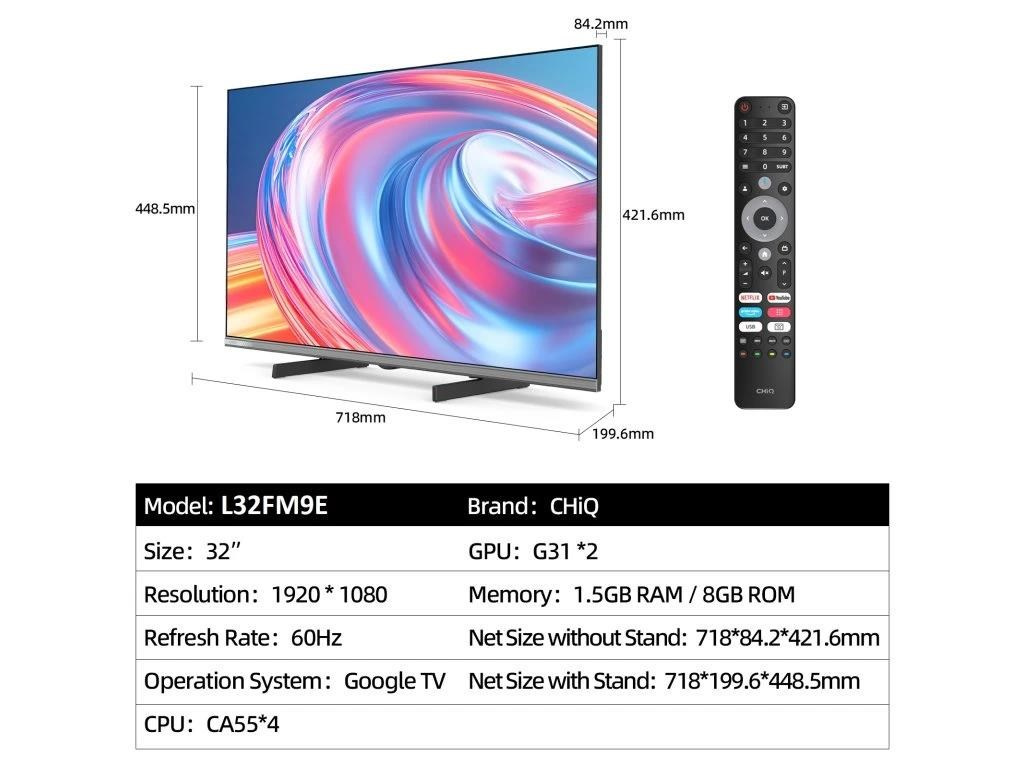 CHiQ L32FM9E TV 32", FHD, LED, metalická bezrámečková, Smart, Google TV, HDR, Chromecast