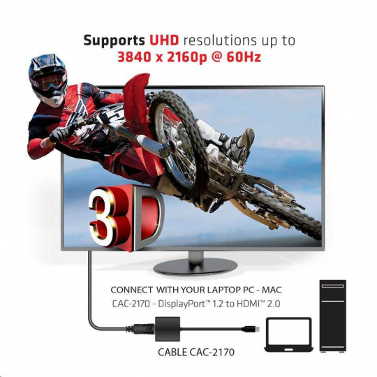CAC-2170 Club 3D je aktívny prevodník signálu HDMI ™ 2.0. Adaptér Mini DisplayPort ™ 1.2 na HDMI ™ 2.0 UHD je najjednoduchšie riešenie pre pripojenie vášho herného PC alebo notebooku, ktoré obsahujú port Mini DisplayPort ™ 1.2, k televízoru, monitoru alebo projektoru s podporou HDMI ™. Adaptér je kompatibilný so špecifikáciou HDMI ™ 2.0, čo umožňuje priepustnosť 6Gbps TMDS na každý kanál. Rozhranie adaptéru má tri trasy pre dáta HDMI, hodiny, signál HPD a napájanie, ktoré ponúkajú celkovú priepustnosť 18 Gb/s TMDS.