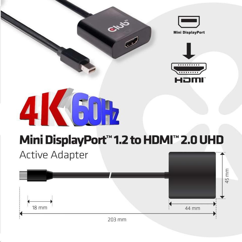 Club-3D MINI DISPLAY PORT 1.2 MALE TO HDMI 2.0 FEMALE 4K 60HZ UHD/ 3D ACTIVE ADAPTER