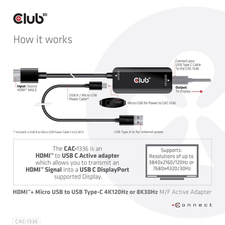 The Club 3D CAC-1336 is the perfect solution to connect to any USB Type-C 8K30Hz or 4K120Hz ready displays from a HDMI™ source which does supports these resolutions/specifications.
