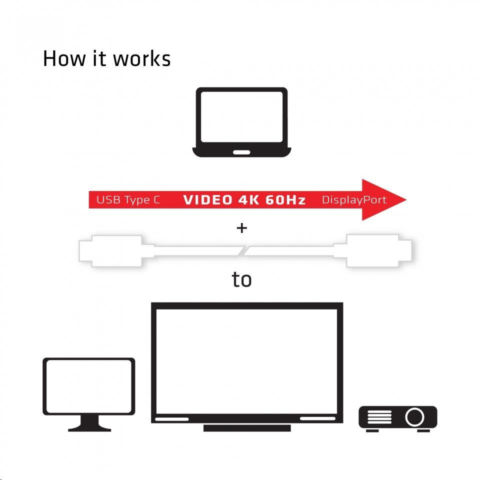 CAC-1517 Club 3D je prevodník signálu DisplayPort ™. Adaptér USB 3.1 Type C na DisplayPort ™ 1.2 UHD je najjednoduchšie riešenie pre pripojenie zdrojového zariadenia obsahujúceho port USB 3.1 typu C s alternatívnym režimom DisplayPort ™ k (U)HD monitoru, televízoru alebo projektoru s podporou rozhrania DisplayPort ™ 1.2. Napájaný portom USB typu C adaptér nevyžaduje žiadne externé napájanie a je ideálne pre použitie s najnovšími notebookmi / MacBookom (Pro) a tabletmi.