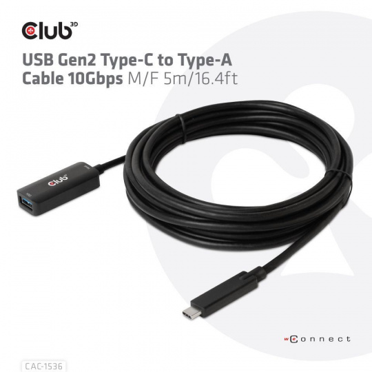 Club 3D CAC-1536 Kábel USB Gen2 Type-C na Type-A 10Gbps M/F 5m/16.4ft kábel pripojí váš notebook, tablet alebo telefón s výstupom USB typu C k vašim obľúbeným existujúcim periférnym zariadeniam, príslušenstvu a nabíjačkám s bežným konektorom USB typu A. Umožňuje prenos dát a napájanie cez jeden kábel a oboma smermi. Tento kábel podporuje rozhranie USB 3.2 GEN 2. SuperSpeed+ dáta až do 10 Gb/s a výstup až 900 mA na downstream nabíjanie alebo napájanie notebooku, tabletu alebo smartfónu s rozhraním USB typu A.