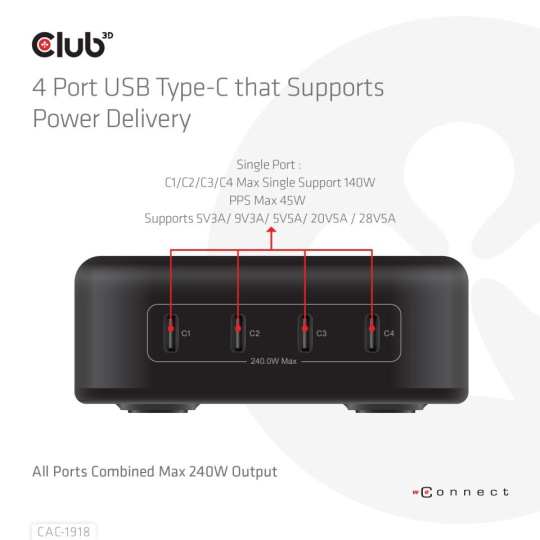 Cestovná nabíjačka Club 3D CAC-1918 240 Watt GaN technológia, štvorportový USB Type-C, Power Delivery (PD) 3.1 a podpora PPS je vysoko výkonná cestovná nabíjačka s módnym dizajnom. Všestrannosť: Perfektné riešenie pre potreby obchodných cestujúcich a náročných používateľov a viac portov. To znamená, že pre všetky vaše moderné zariadenia potrebujete iba jednu nabíjačku a nemusíte sa báť nosiť viac adaptérov.