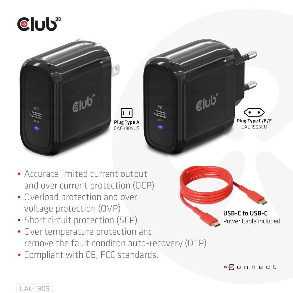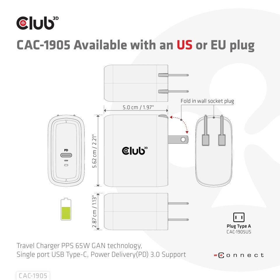 Cestovná nabíjačka Club3D CAC-1905 PPS 65W technológia GAN, jeden port USB typu C, Power Delivery(PD) 3.0 Podpora. Kompaktné rozmery a vynikajúci výkon: Vďaka čipovej súprave s technológiou GAN je táto nabíjačka o 50 % menšia ako 65W nabíjačka MacBook, dostatočne malá na to, aby ste ju mohli nosiť kamkoľvek so sebou.Programovateľný napájací zdroj (PPS) 65W nástenná nabíjačka sa hodí na rôzne zariadenia PD od smartfónov po notebooky, pričom nabíjanie je jednoduché pre všetkých. Táto nabíjačka so širokou kompatibilitou bude vaším pohodlným spoločníkom počas služobnej cesty alebo dovolenky.