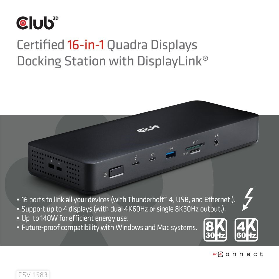 Club 3D CSV-1583 je dokovacia stanica Quadra Displays 16 v 1 s certifikáciou Thunderbolt 4 a DisplayLink, ktorá poskytuje najpokročilejšie, najúčinnejšie a najvšestrannejšie dostupné I/O riešenie s rýchlosťou až 40 Gb/s pre dáta a video. Zo všetkých 7 video portov umožňuje výstup max. 3 videí pri pripájaní k M1, M2 a M3; 4 videá pri pripájaní k M1 Pro/Max, M2 Pro/Max, M3 Pro/Max a ďalším notebookom radu Mac a notebookom Windows.