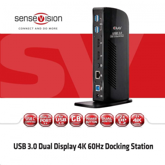 USB 3.0 Dokovacia stanica s dvoma displejmi 4K60Hz Je plne kompatibilný s rozhraním USB C a súčasťou balenia je kábel USB C. S týmto CSV-1460 môžete teraz pripojiť dve obrazovky s rozlíšením 3840x2160 UHD pri 60 Hz k takmer všetkým existujúcim notebookom alebo tabletom len pomocou jedného USB 3.1 port Gen 1! Vďaka pokročilému čipu DisplayLink™ DL-6950 môžete dokonca pripojiť jednu obrazovku s rozlíšením 5K pri 60 Hz! SenseVision USB 3.dokovacia stanica 1 Gen 1 s dvoma displejmi má praktický dizajn a odnímateľný stojan, ktorý umožňuje umiestnenie na stôl v horizontálnej alebo vertikálnej polohe. Je to nástroj na zvýšenie produktivity pre každého výkonného používateľa pracujúceho v (polo)profesionálnom prostredí. Duálny režim DisplayPort™ TECHNICKÉ ŠPECIFIKÁCIE .
