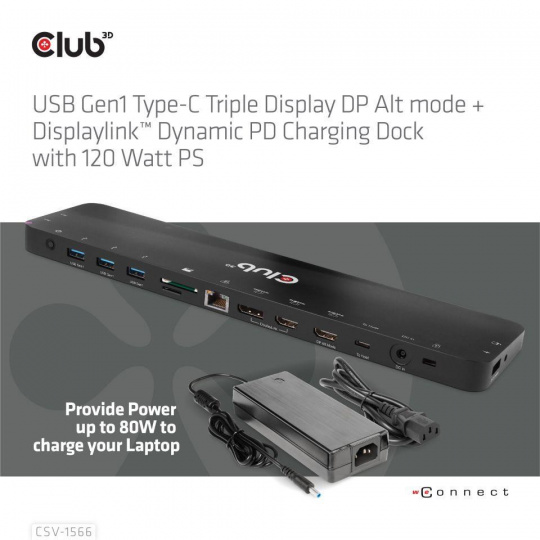 Club 3D CSV-1566 USB Gen1 Type-C Triple Display DP™ Alt mode + Displaylink™/ USB mode™ Dynamic PD Charging Dock so 120 W PS je integrované riešenie kombinujúce video, dáta, napájanie, ethernet a zvuk. Táto dokovacia stanica sa dokonale hodí na rozšírenie portu typu C alebo portu USB-A (prostredníctvom prevodníka typu C na USB), aby poskytovala viacero zvukových, video, dátových a napájacích portov, a predstavuje tak ideálne riešenie pre používateľov, ktorí potrebujú viacero portov. Tento dok má 3 video porty (2 HDMI™, jeden z DP™1.2 režimy Alt, jeden z režimu USB, 1 Displayport™ z režimu USB) pre zážitok z videa, 4 USB Gen1 Type-A a 1 USB Gen1 Type-C pre prenos dát, RJ45 pre super vysokorýchlostný Ethernet, sloty na karty SD/TF pre pripojenie pamäťových kariet. Okrem toho má inteligentný nabíjací port, ktorý prináša rýchle nabíjanie pripojených mobilných zariadení (telefóny Apple, Samsung, podložky atď.). Na napájanie funkcií tohto doku a nabíjanie hostiteľa s maximálnym výkonom 80 W (20 V/4 A) sa dodáva 120 W napájací adaptér. Tento dok má spodnú konštrukciu, ktorú možno umiestniť pod hostiteľa. Môže pracovať na DP™1.2 Podporované hostiteľské zariadenia USB typu C a -A v režime Alt.