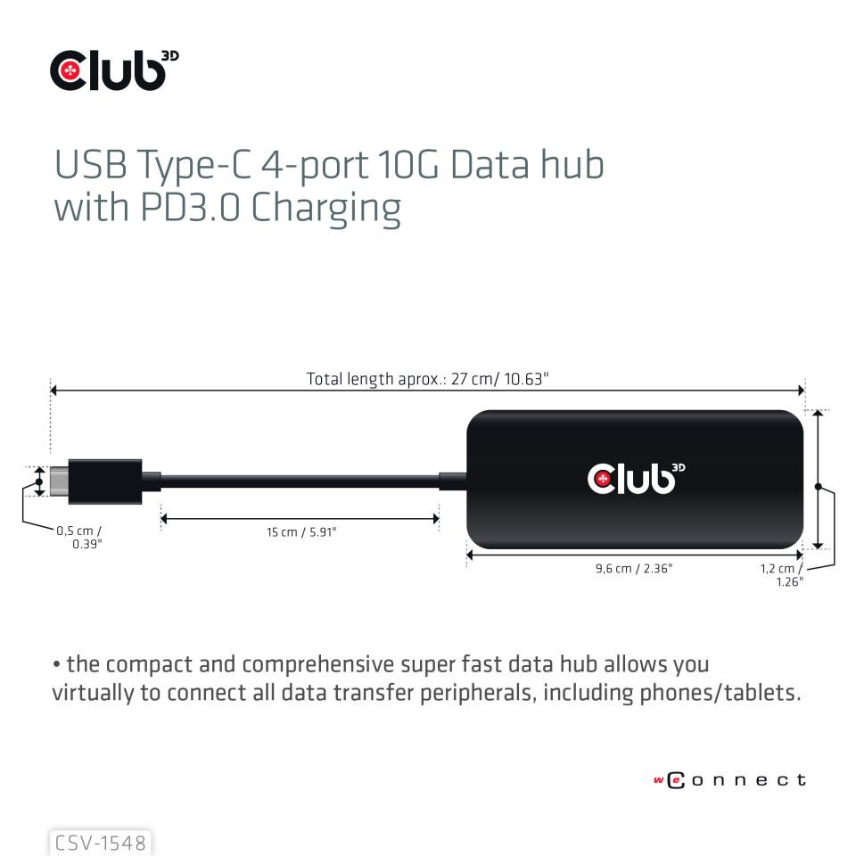 Club 3D CSV-1548 USB Type-C 4portový 10G datový rozbočovač s nabíjaním PD3.0, kompaktný a komplexný super rýchly dátový rozbočovač umožňuje virtuálne pripojiť všetky periférne zariadenia pre prenos dát, vrátane telefónov/tabletov. Rozbočovač je kompatibilný s novými periférnymi zariadeniami USB Gen2 aj spätne kompatibilný so staršími zariadeniami USB, maximálna rýchlosť prenosu dát až 10 Gbps (1280 MB/s). Rozšírené pripojenie pre existujúce zariadenia, ako je pevný disk, SSD, USB flash, myš, klávesnica a/alebo tlačiareň. Hub tiež podporuje nabíjanie Power Delivery 3.0 na 1 porte.