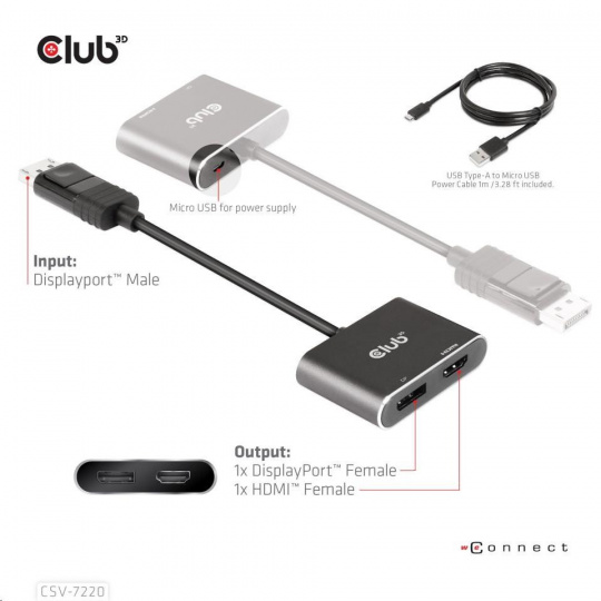 | V krabici | - CSV-7220, rozbočovač MST DisplayPort™ 1.4 na DisplayPort™ + HDMI™ 4K60Hz M/F - Napájací kábel USB typu A na Micro USB 1 m /3.28 stôp |