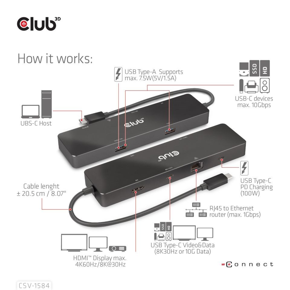 Club 3D CSV-1584 je USB 3.2 Gen2 Type-C, 6-in-1 Hub s HDMI™ 8K30Hz/4K60Hz, 2xUSB Type-A (10G), Ethernet RJ45 (1Gbps) a 2xUSB Type-C, 1x Video 4K60Hz alebo Dátové (10G) a 1xPD3.0 nabíjanie 100 wattov, čo poskytuje ideálne riešenie pre rozšírenie portu USB Type-C alebo hostiteľa Thunderbolt (PC/Laptop/mobilný telefón atď.), najmä pre tých, ktorí sú hostiteľmi s jedným USB Type-C portom. Tento rozbočovač využíva integrovaný obvod s podporou režimu DP1.4 Alt, ktorý umožňuje výstup maximálneho jedného 8K30Hz (DSC) alebo dvoch rôznych videí (2× 4K60Hz) a port USB Type-C Video tiež podporuje prenos dát USB3.2 Gen2 s maximálnou rýchlosťou 10 Gb/s. 2 video porty USB Type-A a USB Type-C umožňujú pripojiť 3 USB zariadenia súčasne. Port Gigabit Ethernet vám umožní surfovať na internete, port USB Type-C PD Charging podporuje max. 100W PD Charging. Môže fungovať na všetkých hostiteľoch USB Type-C s podporou režimu DP Alt.