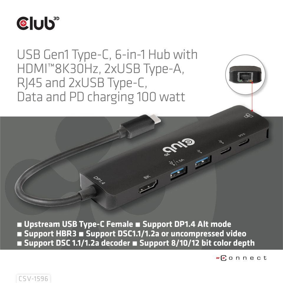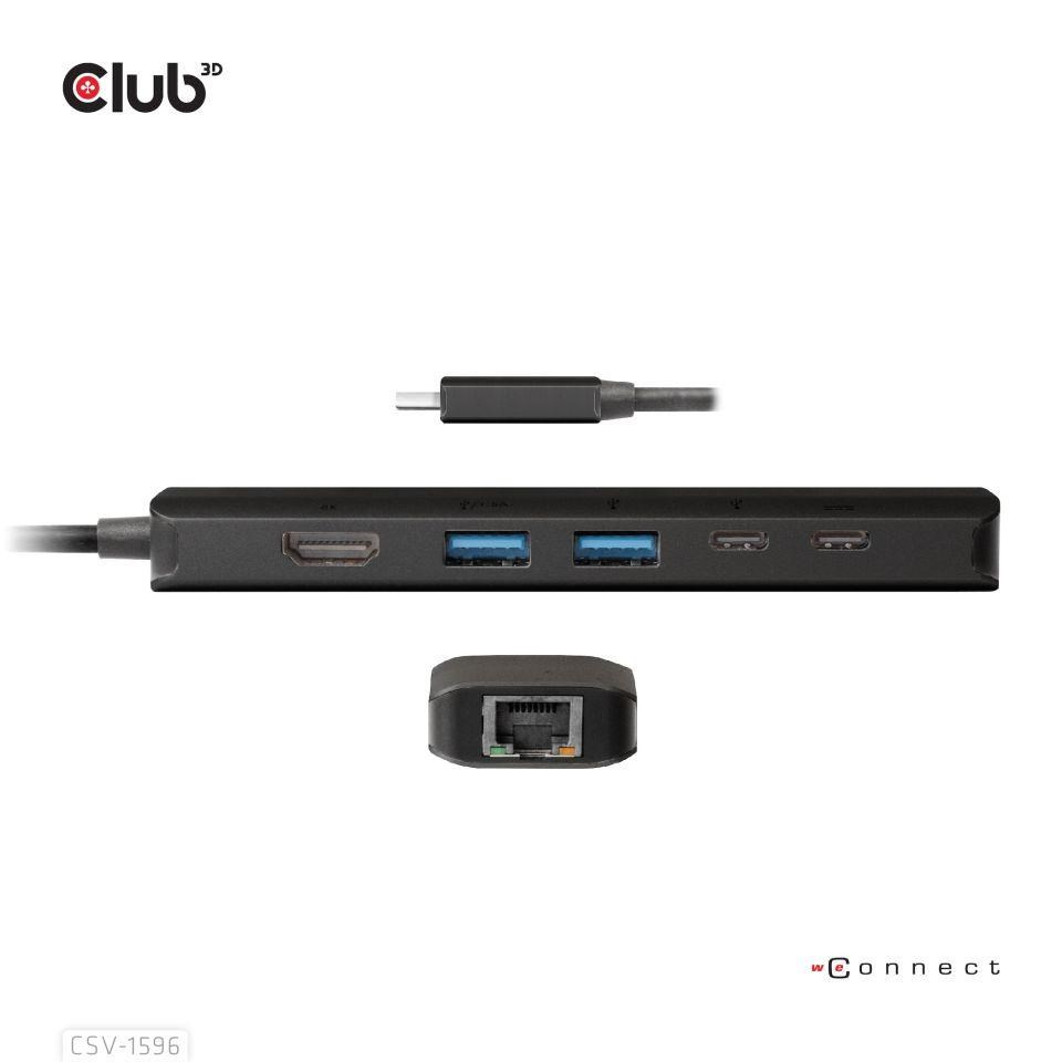 Club3D Hub USB-C, rozbočovač 6 v 1 s HDMI 8K30Hz, 2xUSB typu A, RJ45 a 2xUSB typu C, Data a PD nabíjení 100W