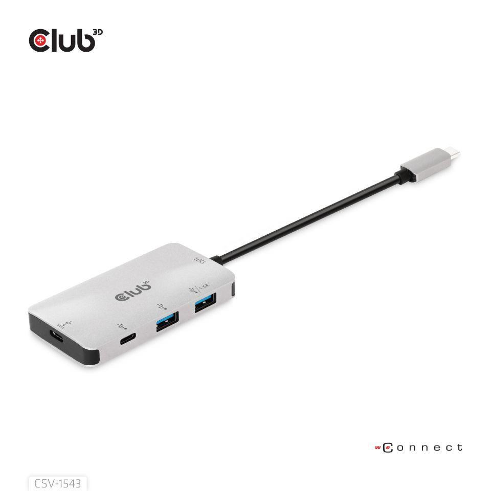 Club 3D CSV-1543 je nabíjací rozbočovač USB Gen2 Type-C PD na 2x porty Type-C 10G a 2x porty USB Type-A 10G.Dva porty USB typu A sú určené na prenos dát a jeden z dvoch portov USB typu A môže poskytovať 1.5A nabíjanie pre pripojené zariadenia USB typu A (mobilné telefóny, tablety, U-disky atď.). Jeden z dvoch portov USB typu C je určený na prenos dát a nabíjanie pripojeného zariadenia USB typu C, druhý port USB typu C podporuje prenos dát aj PD3.0 nabíjanie. Môže fungovať na akomkoľvek hostiteľovi USB typu C (PC, notebook, tablet, mobilný telefón atď.), ktorý podporuje režim DP Alt.