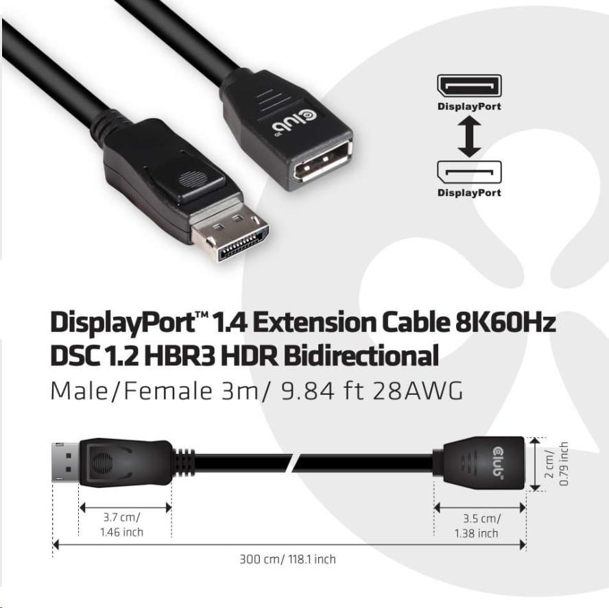 | Klub 3D DisplayPort™ 1.4 Predlžovací kábel 8K60Hz DSC 1.2 HBR3 HDR Obojsmerný samec/samica 3m/ 9.84 stôp 28AWG |