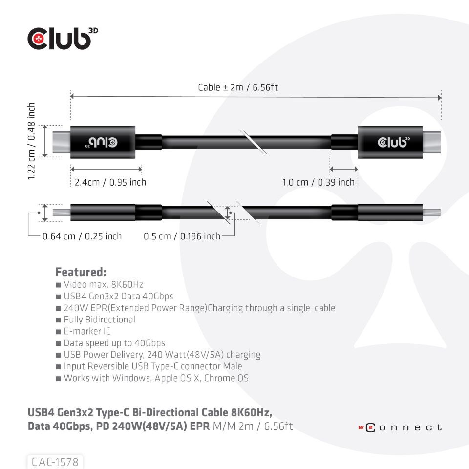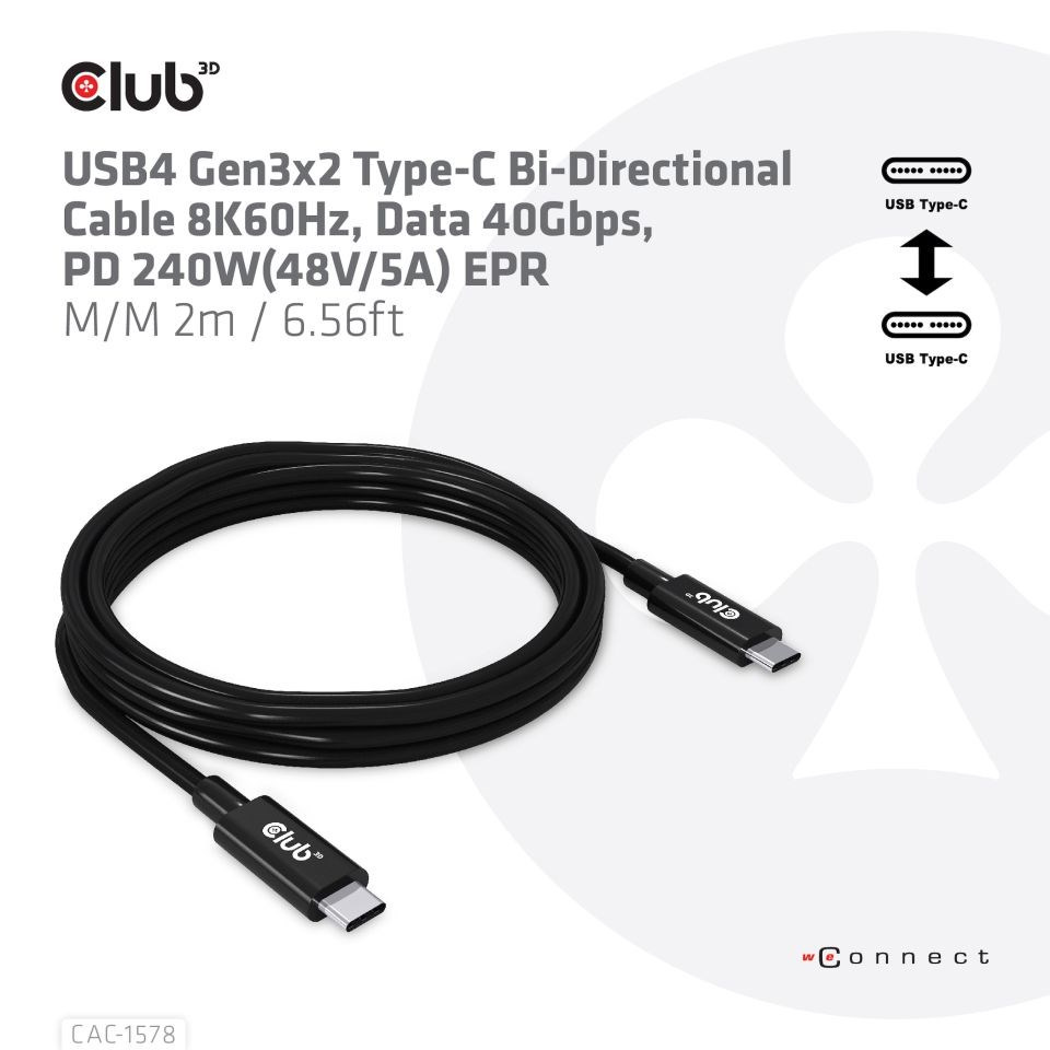 Club 3D CAC-1578 USB4 Gen3x2 Type-C obojstranný kábel 8K60Hz, Data 40Gbps, PD 240W(48V/5A) EPR M/M 2m / 6,56ft pripojí váš notebook, tablet alebo telefón s výstupom USB4 Type-C k vášmu obľúbenému existujúcemu periférnemu zariadeniu, príslušenstvu a nabíjačke. Umožňuje video, dáta a napájanie cez jediný kábel a oboma smermi. Tento kábel podporuje USB4 Gen3x2 Type-C obojstranné video 8K60Hz, Data 40Gbps, PD 240W(48V/5A) EPR M/M 2m / 6,56ft výstup pre downstream nabíjanie alebo napájanie vášho notebooku, tabletu alebo smartphonu.