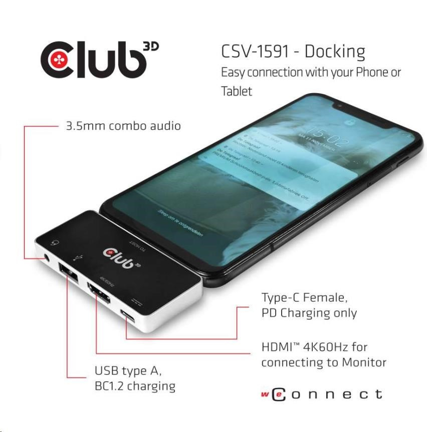 Club3D hub pro mobilní telefony USB Type C 4-in-1 Hub to HDMI™ 4K60Hz USB Type C PD / USB Type A / Audio jack