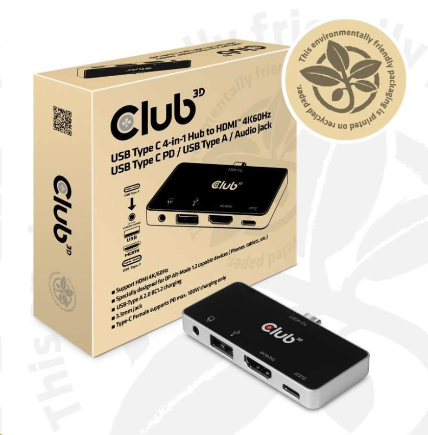 CSV-1591 - Club 3D Hub je rozbočovač 4 v 1 USB typu C s rozhraním HDMI™, USB typu A 2.0, 3.5 mm audio a nabíjanie cez USB typu C PD, dizajn dokonale vyhovuje všetkým zariadeniam s režimom DP Alt. S týmto rozbočovačom si môžete vychutnať video s ultra vysokým rozlíšením hostiteľa na veľkej obrazovke, vychutnať si fantastickú hudbu, prenášať USB 2.0 a pripojte adaptér USB typu C PD na nabíjanie hostiteľa.