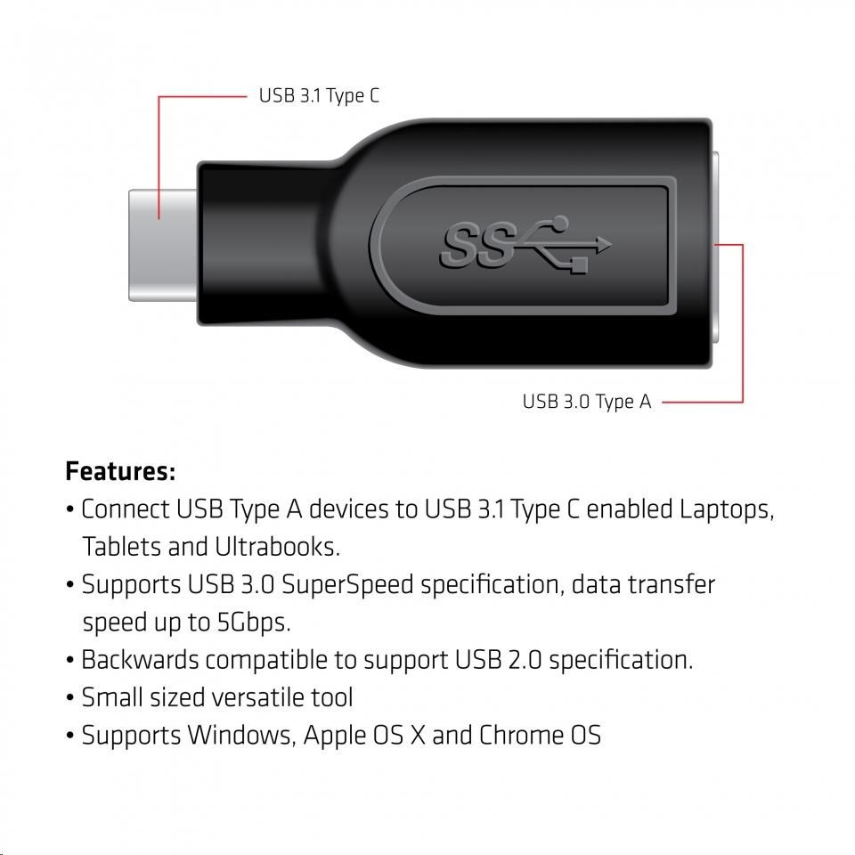 Adaptér Club 3D USB 3.1 type C to USB 3.0 umožňuje pripojenie vašich stávajúcich USB periférií, pamäťových zariadení a dokovacích staníc s rozhraním USB typu A do notebookov, profesionálnych tabletov a Ultrabookov s rozhraním USB 3.1 typu C. Adaptér je spätne kompatibilný a podporuje tiež rozhranie USB 2.0. Špecifikácia USB 3.0 SuperSpeed zaisťuje prenos rýchlosti 5 Gb/s pre rýchly prenos veľkých súborov.
