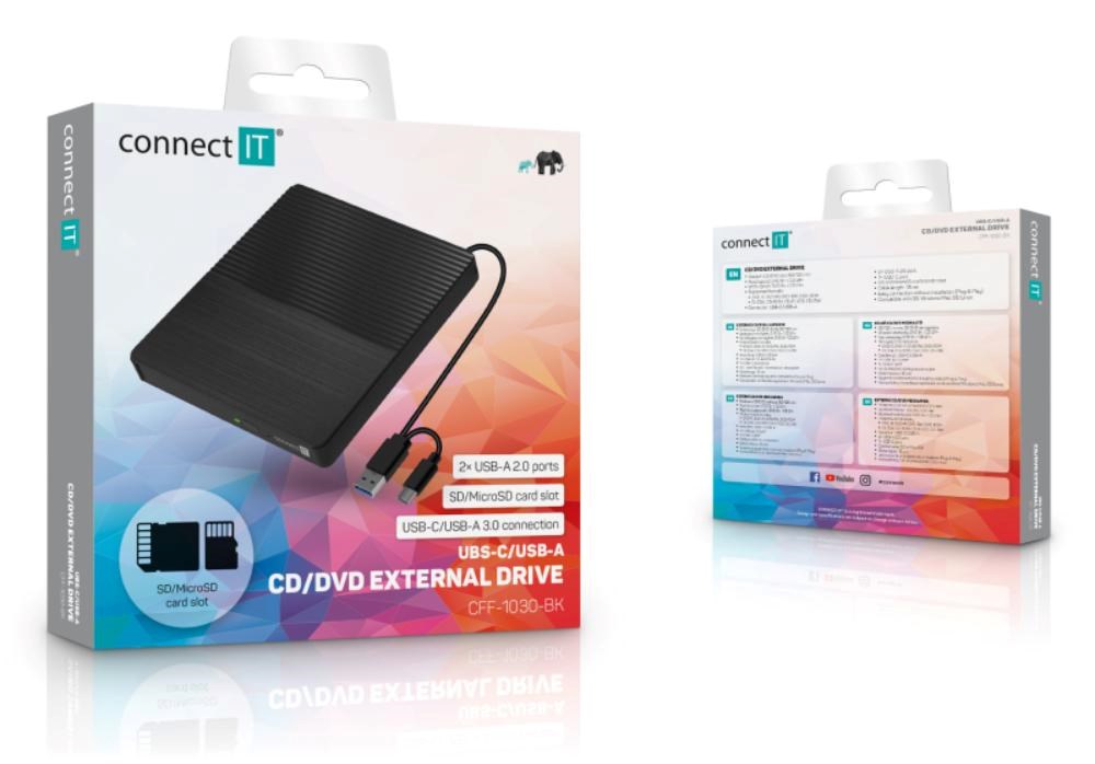 Multifunkční CD/DVD externí mechanika s čtečkou SD/MicroSD paměťových karet a hub s dvěma USB-A porty. Disponuje USB-C a USB-A kabelem pro připojení k PC či notebooku.